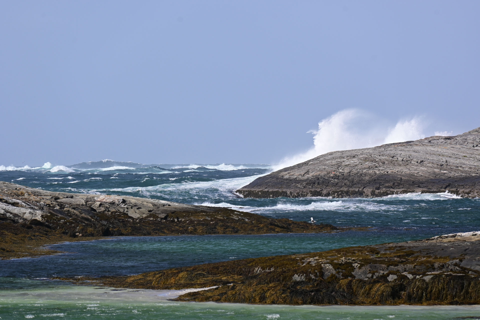Nach einem Sturm brechen die Wellen an den Klippen Lovunds