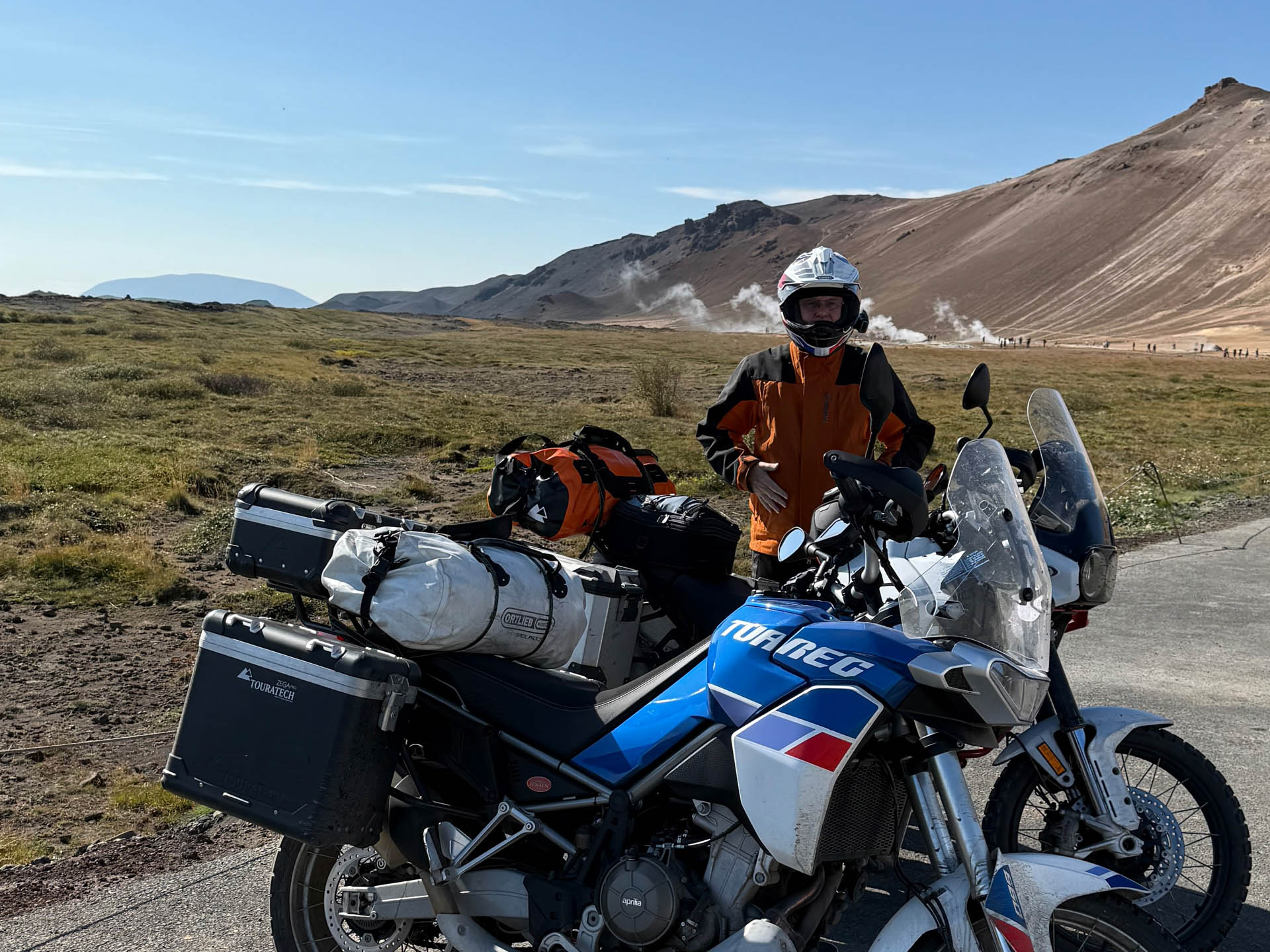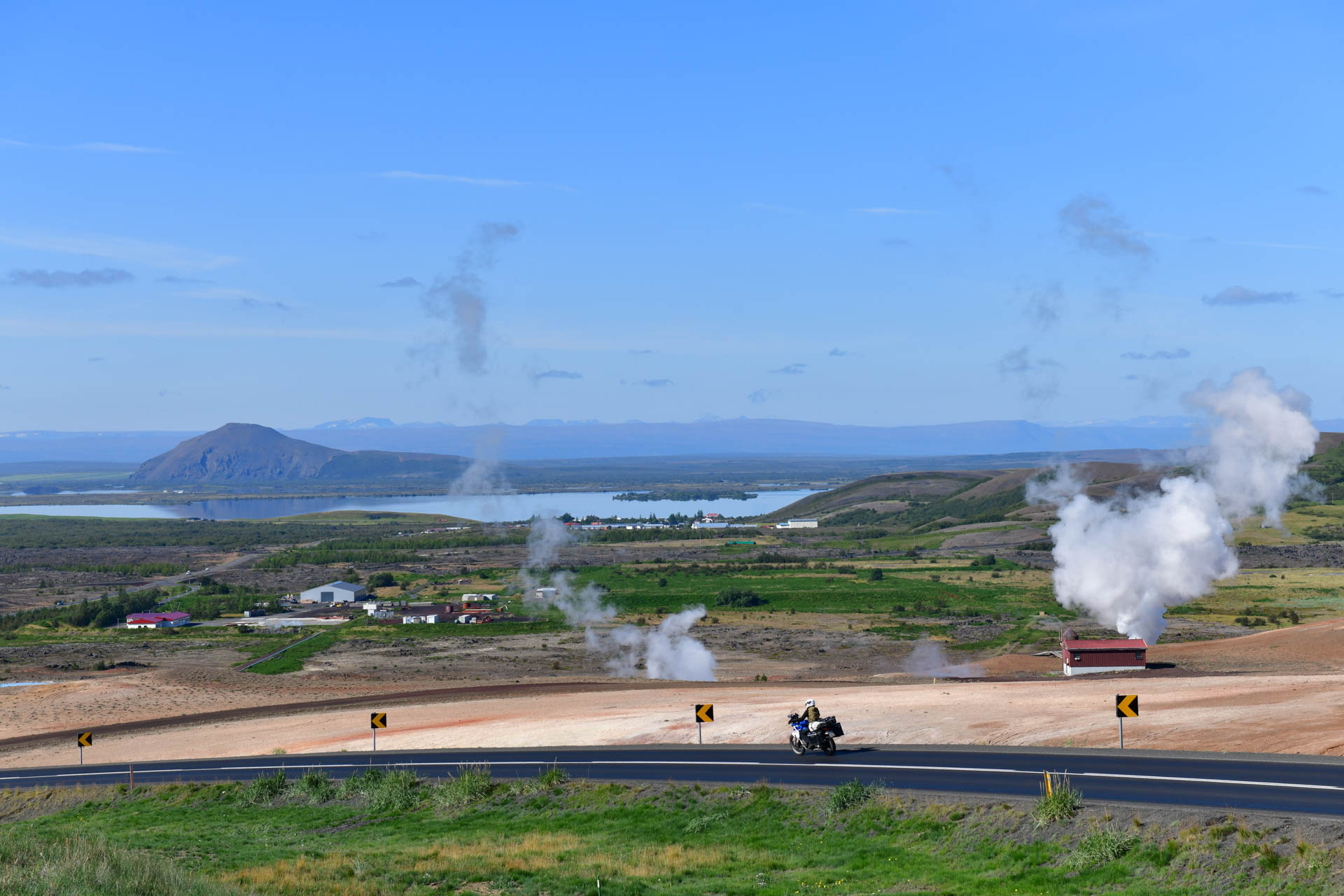 Mit dem Motorrad durch die dampfenden Felder am Myvatn