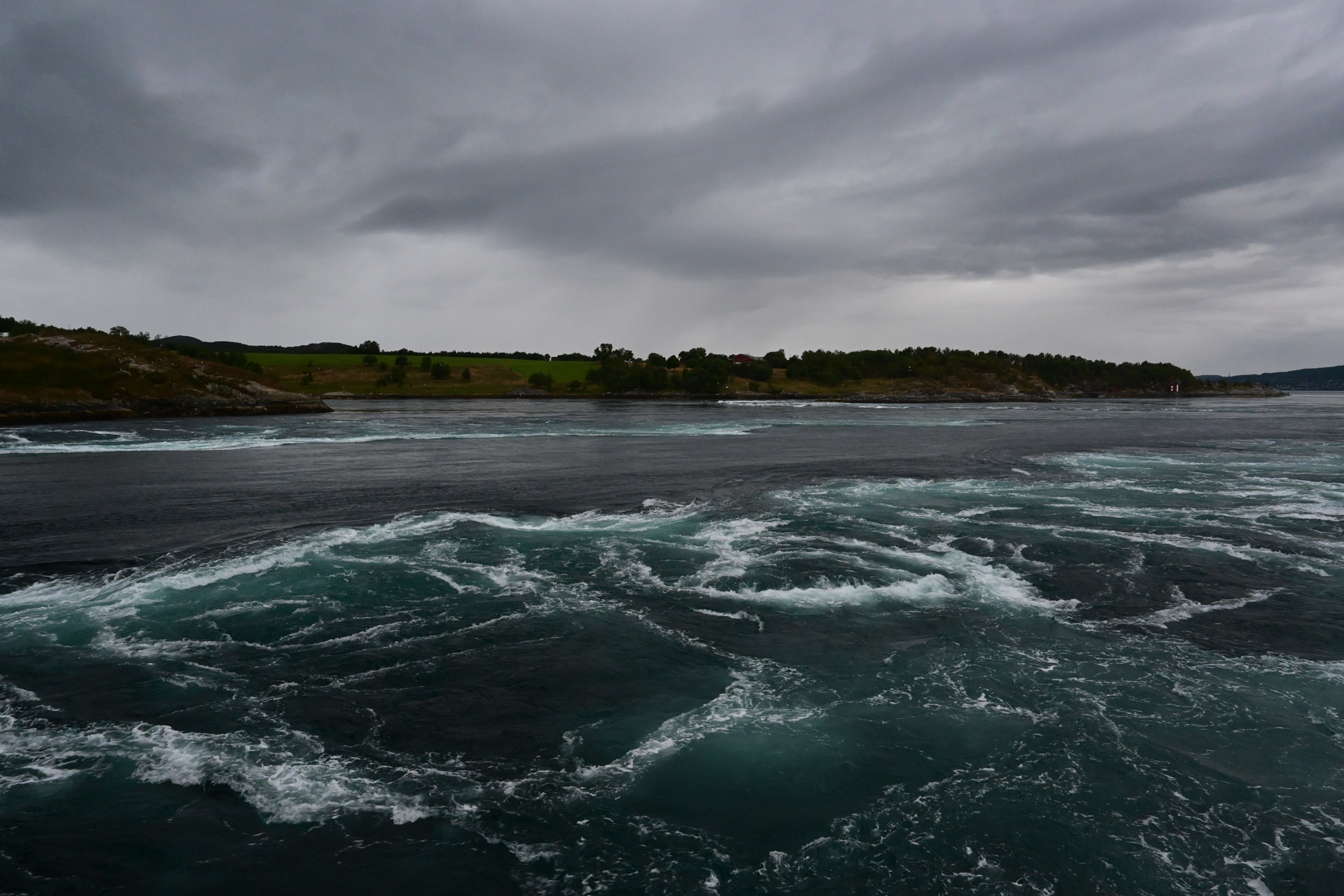 Vom Fähranleger in Bodø ist es nicht mehr weit bis zum Hotel, das direkt am Gezeitenstrom Saltstraumen liegt. Je nach Uhrzeit und Tidenstand wird das Wasser vom Meer durch den engen Sund geradezu brodelnd in die Bucht hinein gepresst oder es strudelt wieder mit Wucht heraus. Sehr sehenswert!