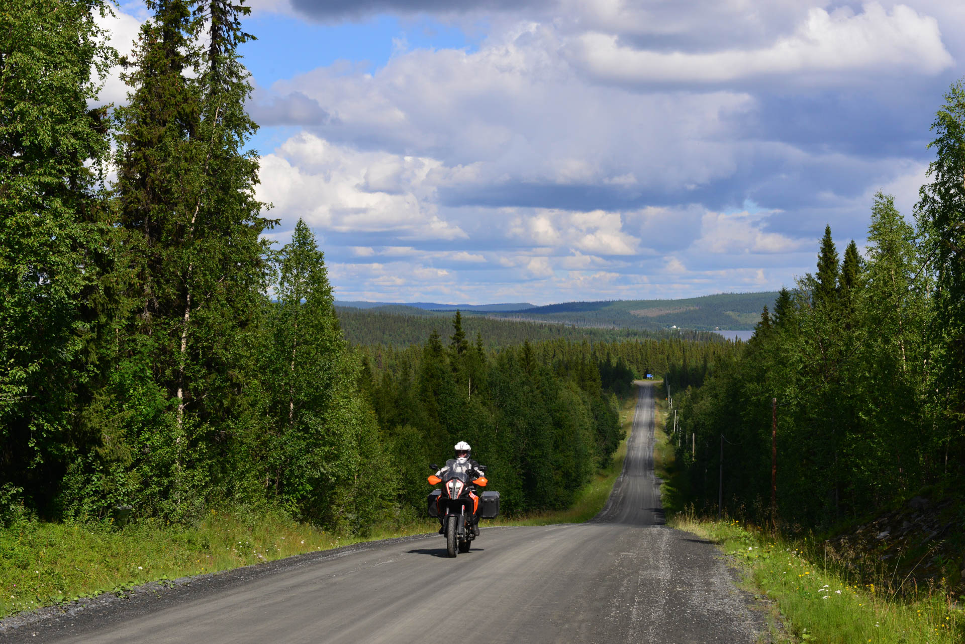 Motorradfahren auf einsamer Piste im Norden Schwedens