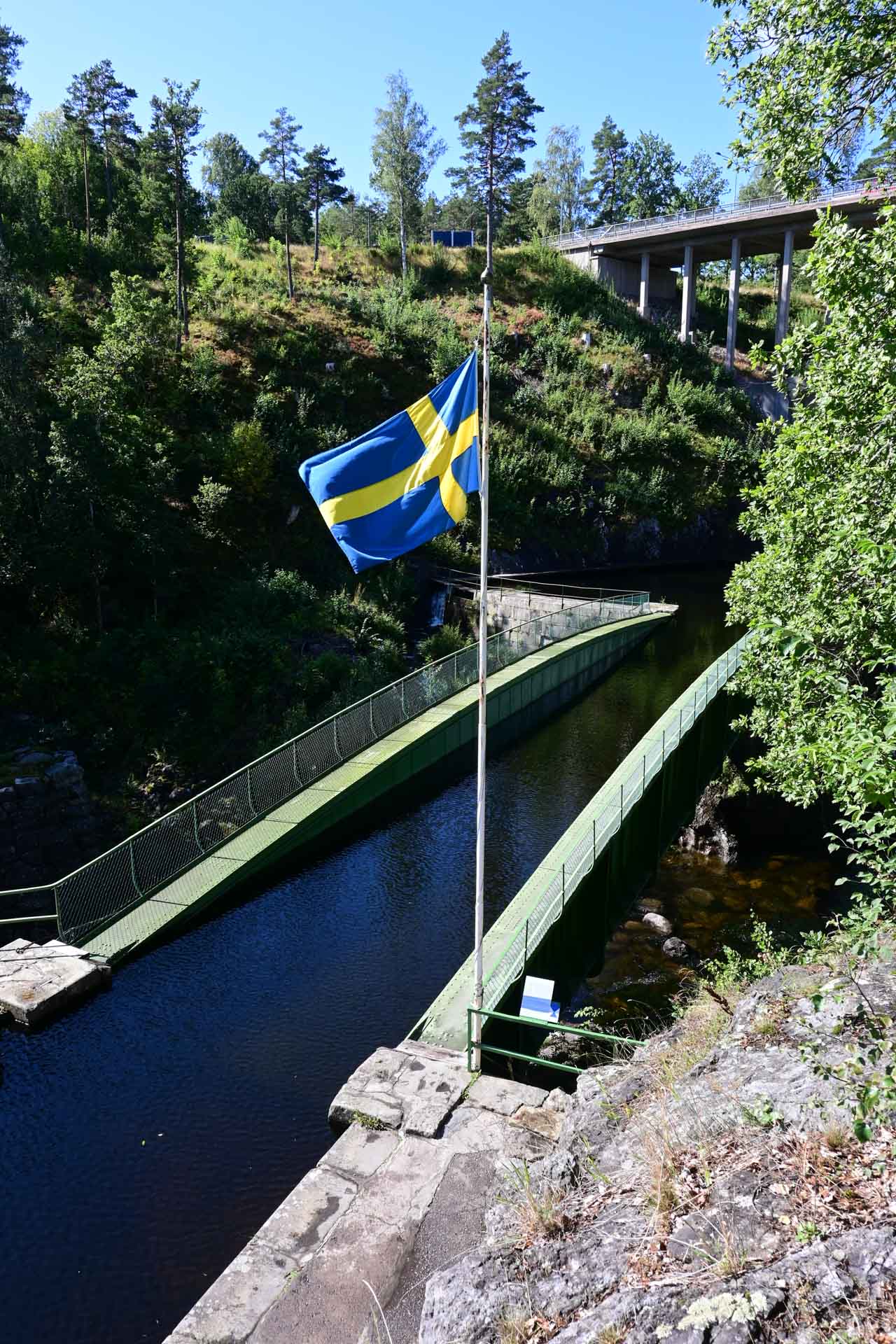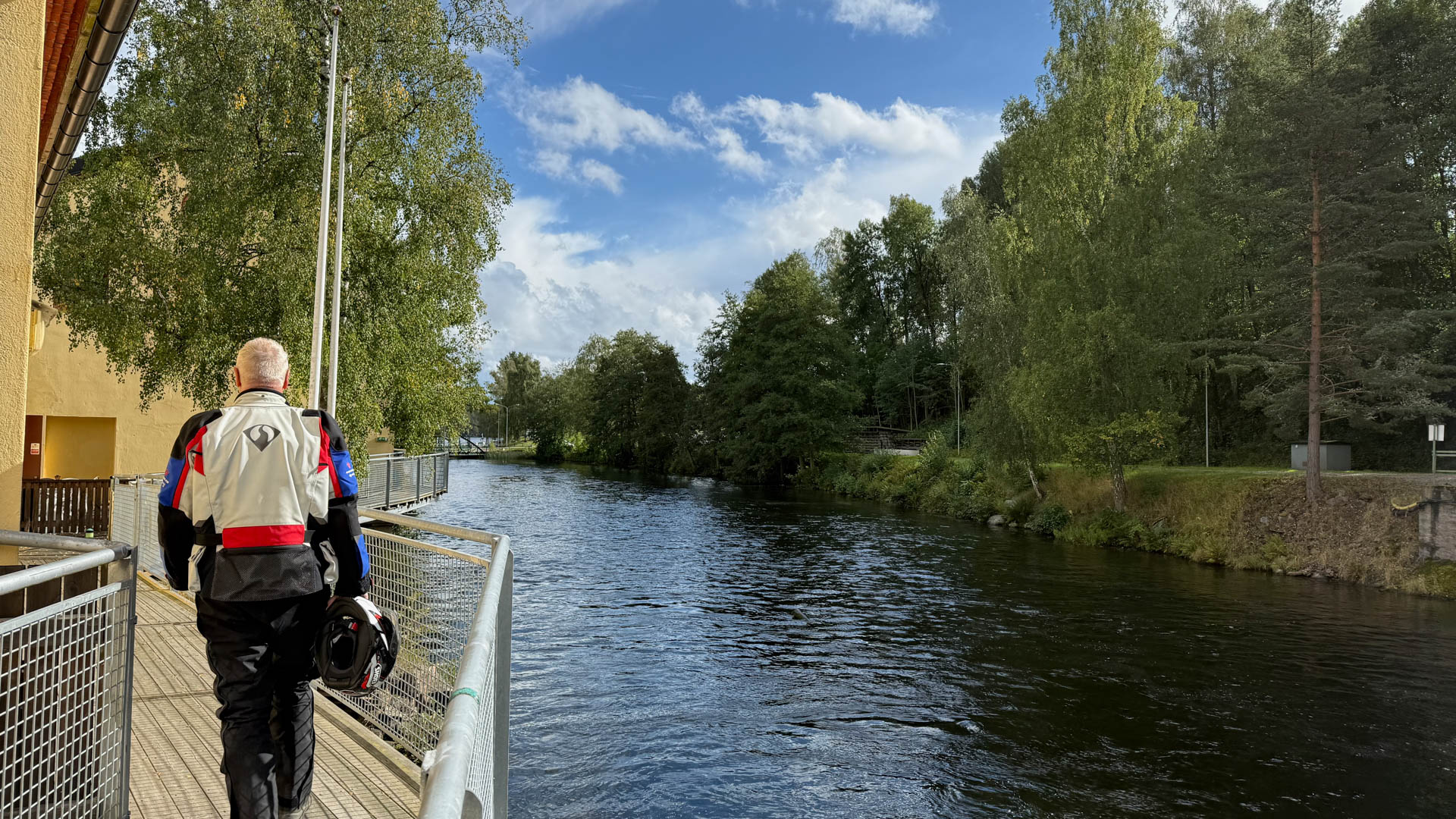 Pause mit dem Motorrad am Wasserfall in Schweden