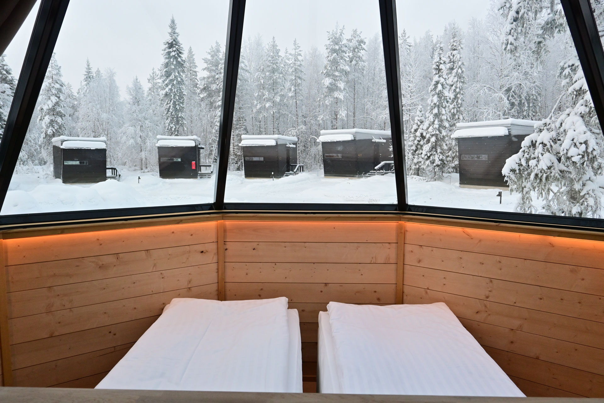 Die Aurora Cabins sind moderne Hütten mit eigenem Bad, deren schräge Panoramafenster einen 180° Blick auf den Himmel zulassen. Unter den Fenstern steht das Bett, sodass man im Bett liegend die Polarlichter beobachten kann. Aufgrund der Bauweise ist das Bett von außen trotzdem nicht einsehbar.